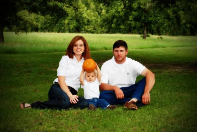 I just love this picture. We were trying very hard to get Gabe to sit for just a second to get a picture of the family. After many tries to distract him, we gave him this pumpkin which he put over his head. I think it is so cute. This is very typical of a one year old.